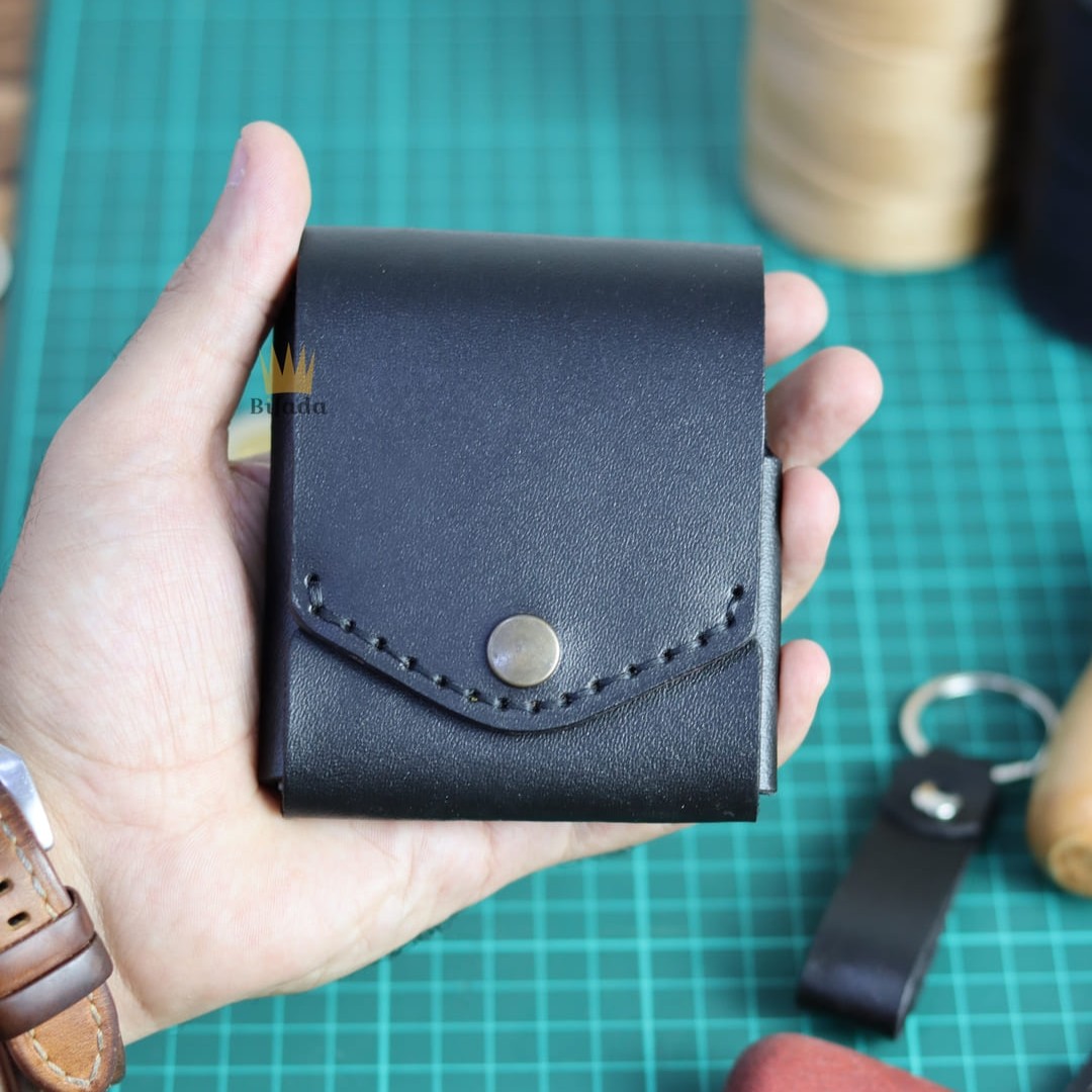 محفظة من الجلد الطبيعي لحمل النقود المعدنية أو البطاقات مصنوعة باليد (اللون الأسود) B