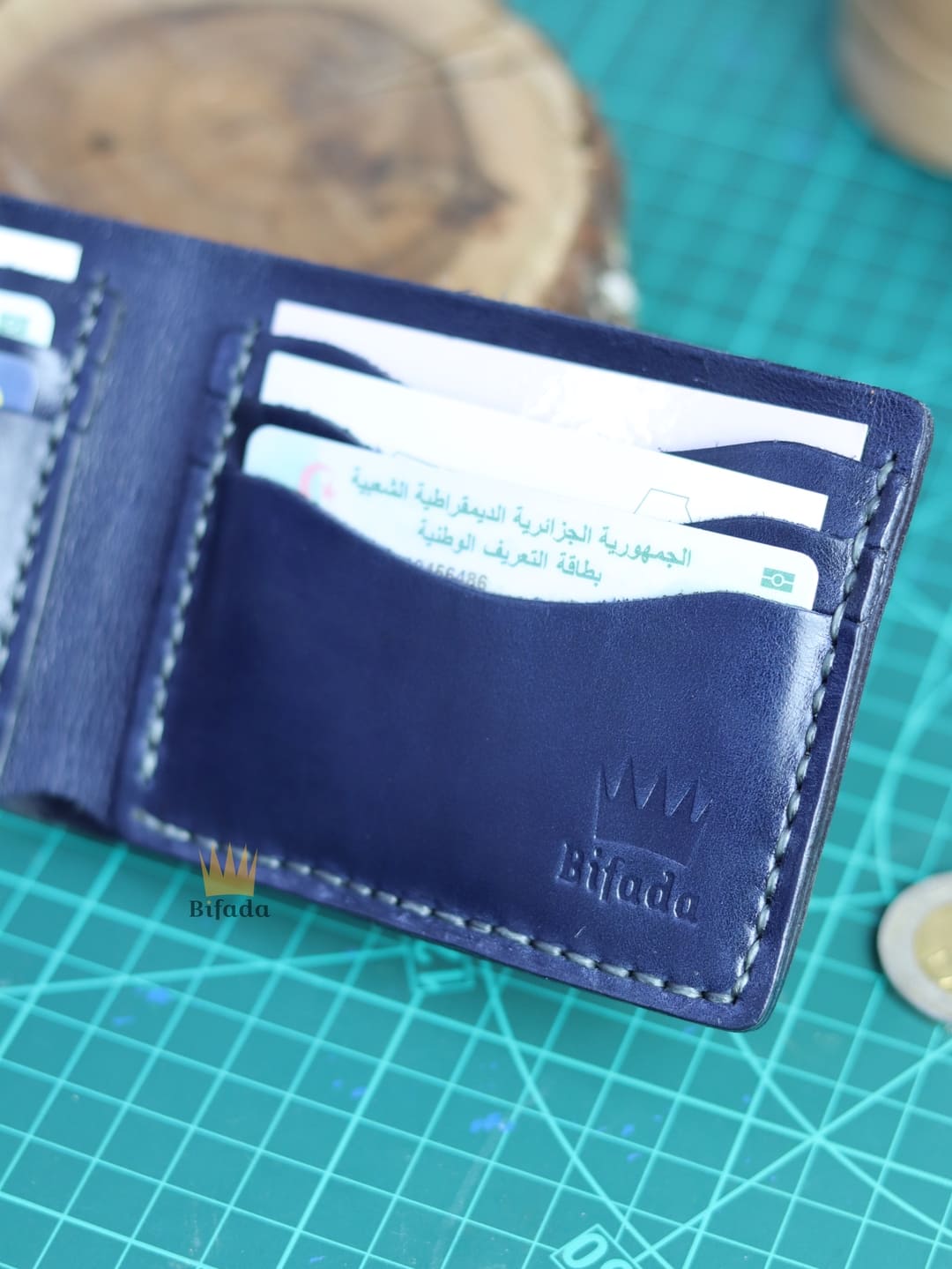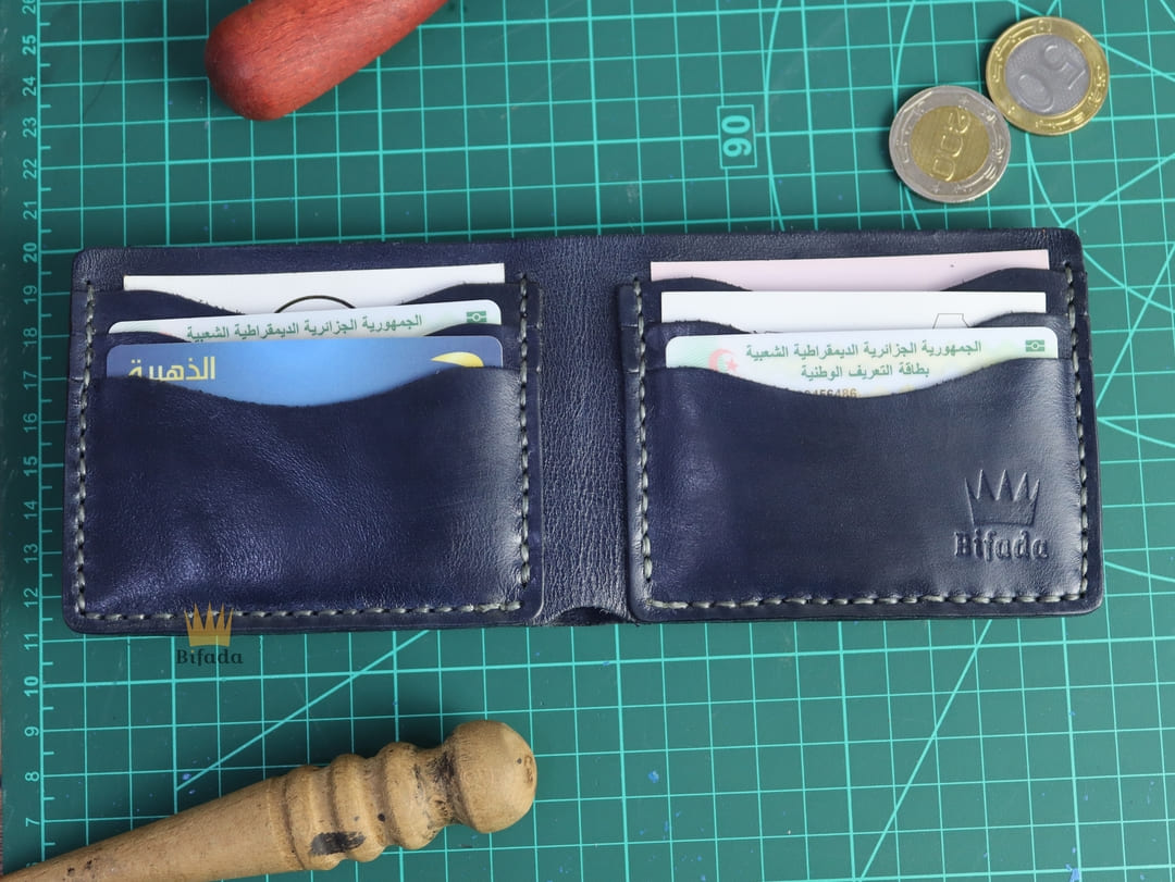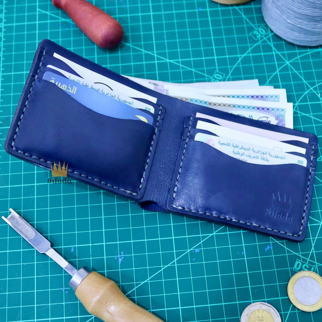 محفظة من الجلد الطبيعي لحمل النقود المعدنية أو البطاقات مصنوعة باليد (اللون الأزرق) B