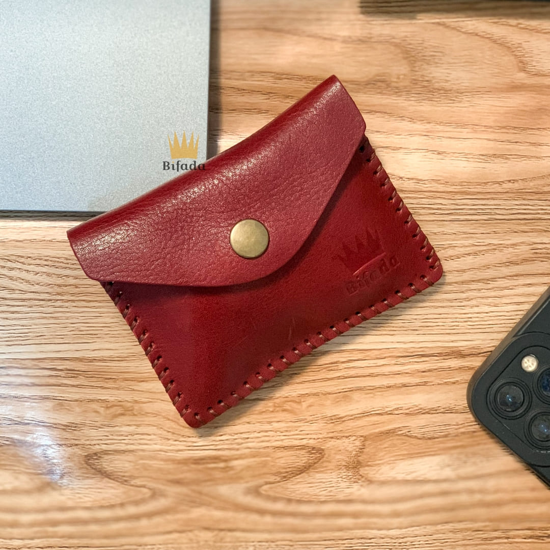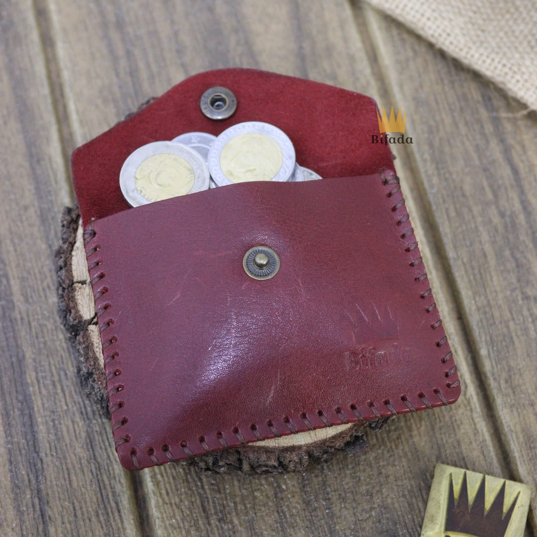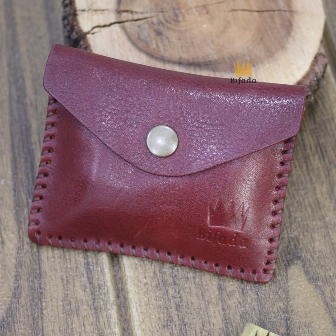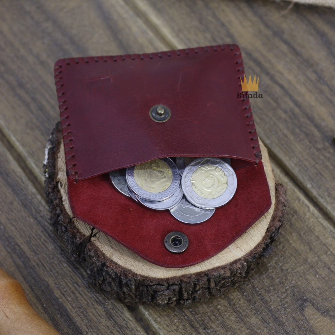 محفظة مميزة من الجلد الطبيعي لحمل النقود المعدنية أو البطاقات + علاقة مفاتيح مجانا (اللون الأحمر العنابي) CP