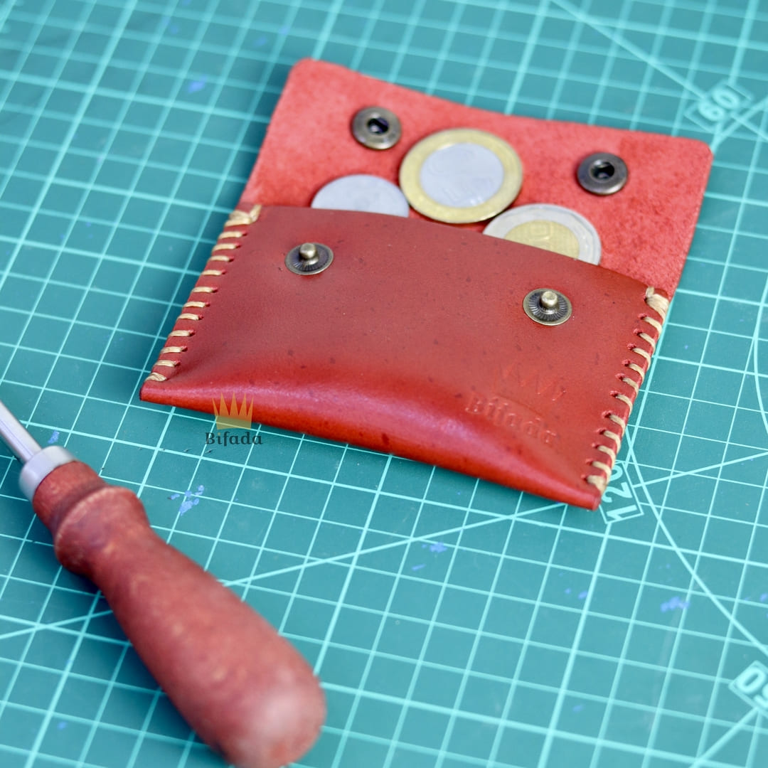 محفظة من الجلد الطبيعي لحمل النقود المعدنية أو البطاقات مصنوعة باليد (اللون الأحمر) B